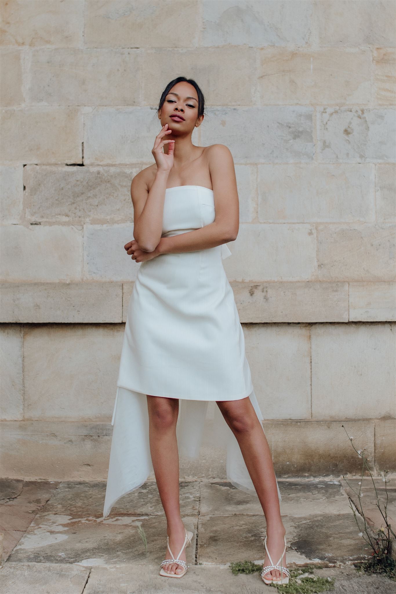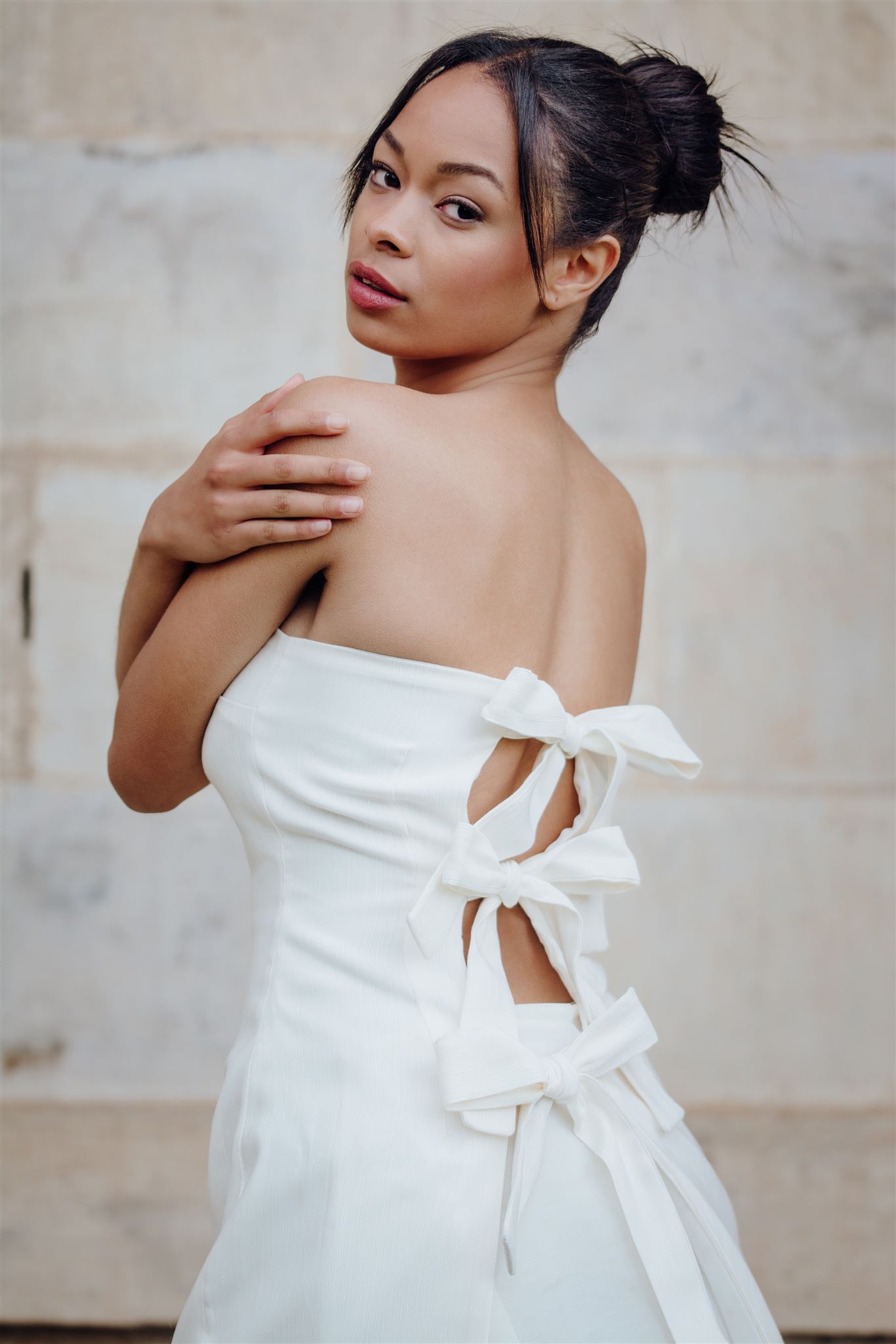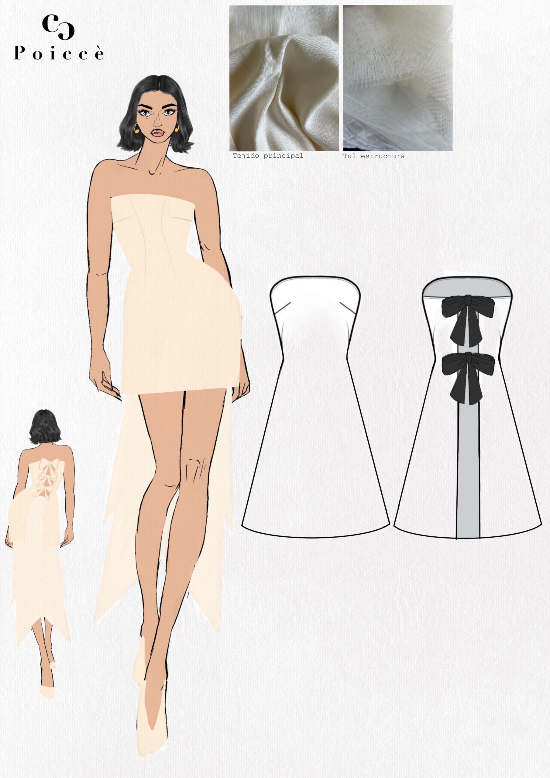El conjunto Isa se compone de dos piezas. Un vestido palabra de honor confeccionado en un tejido con textura muy especial. Mezcla con algodón y hebras satinadas. La segunda pieza es interior y lleva incorporada una estructura de tul que juega con el volumen y con la silueta, dando como resultado una pieza única, muy especial, divertida y elegante.