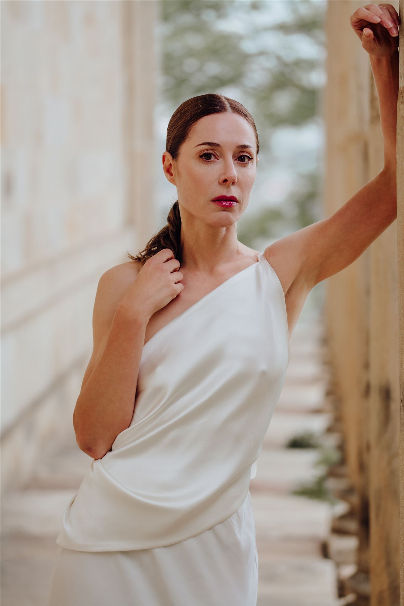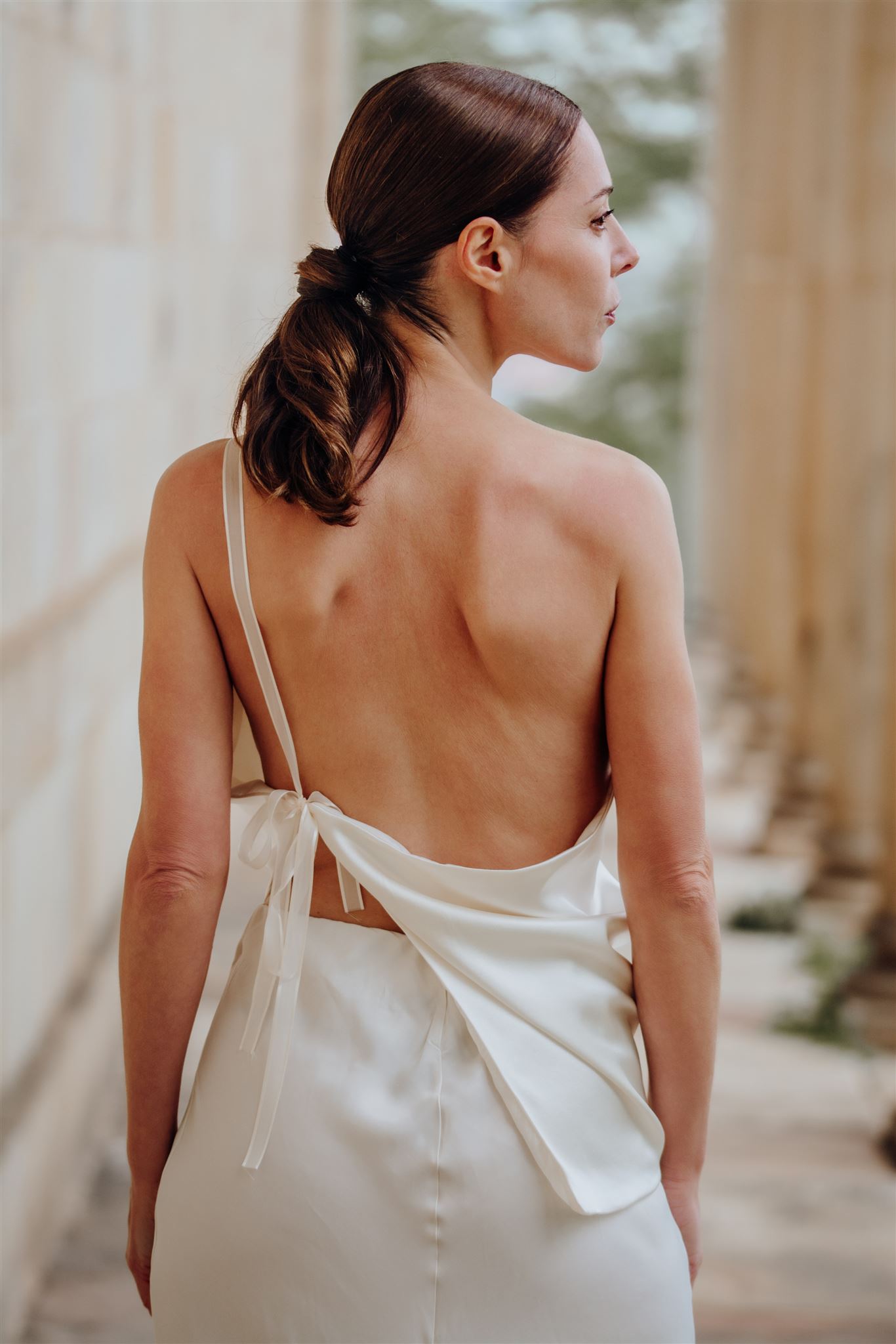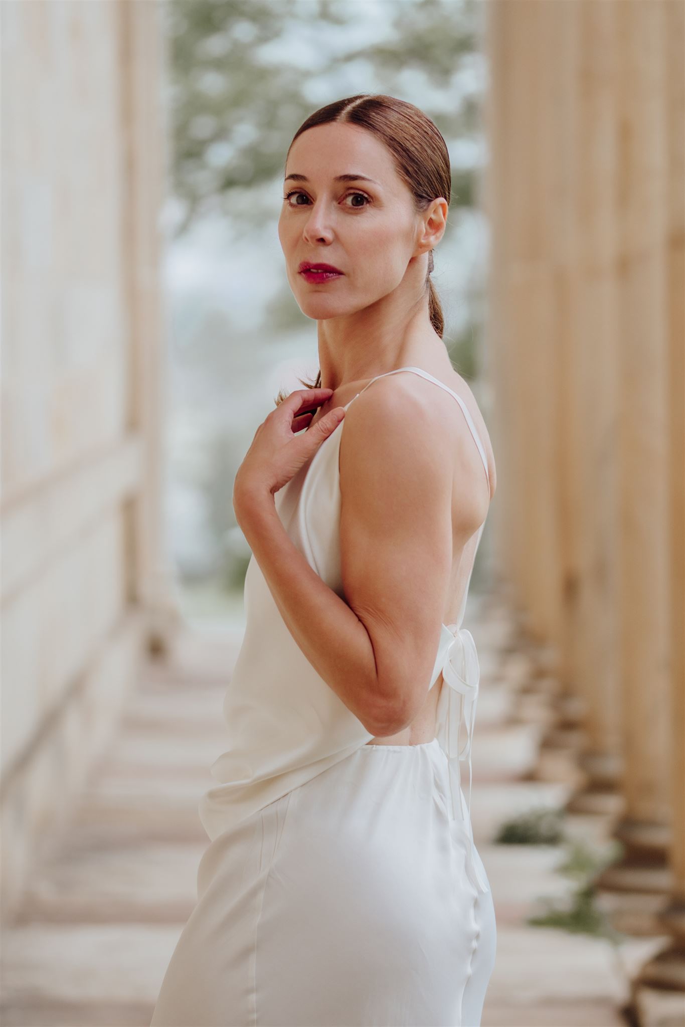 El top Emma está confeccionado en un tejido tipo piel de ángel con mezcla de seda. los tirantes lazo son elegantes y a la vez modernos, decorando y sujetando la pieza de espalda descubierta.