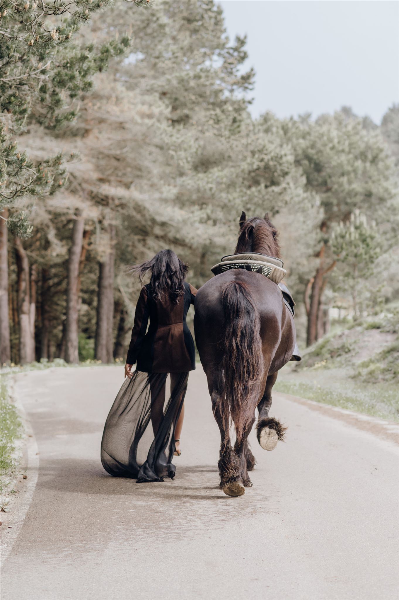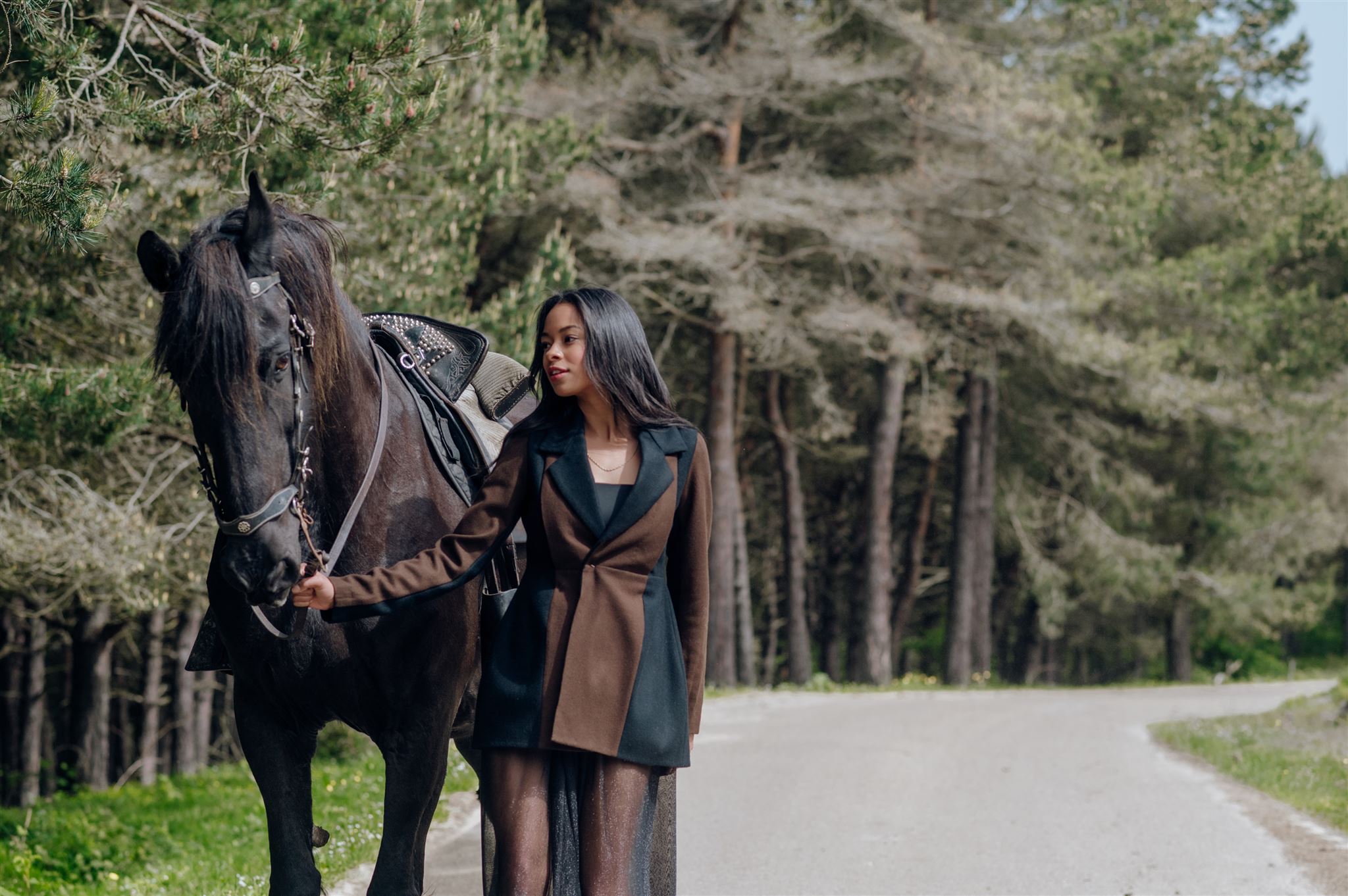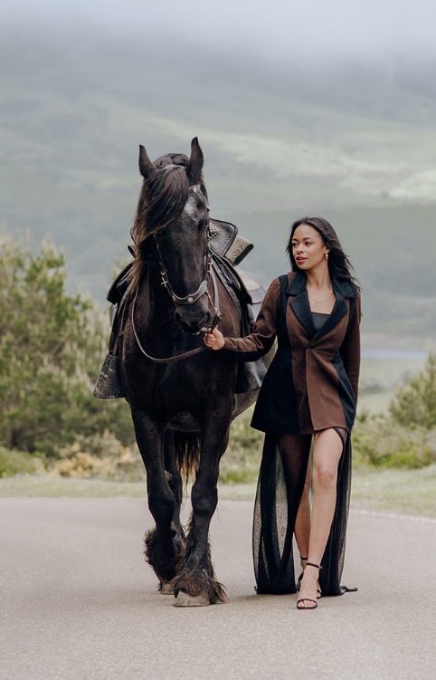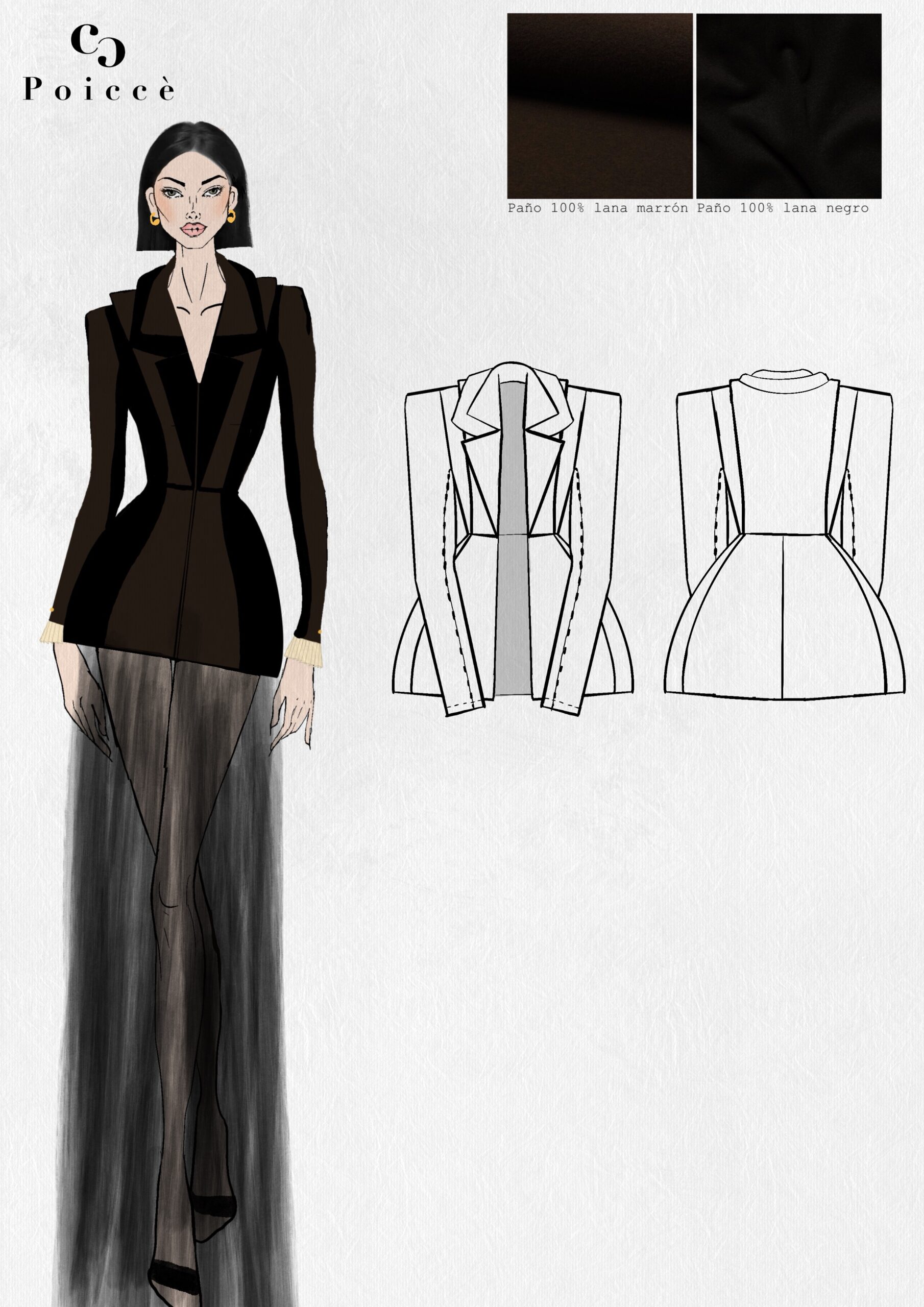 La chaqueta Sara es una vuelta a mis orígenes, bautizada con el nombre de mi madre, he elegido el tejido con el que se confecciona el traje regional del pueblo en el que me crié, Reinosa. Juego con la ilusión de que hay dos prendas en superposición, una chaqueta y un chaleco, cuando en realidad es una sola pieza. Resalta las curvas del cuerpo femenino y combina el negro y el marrón chocolate estilizando al máximo la silueta.