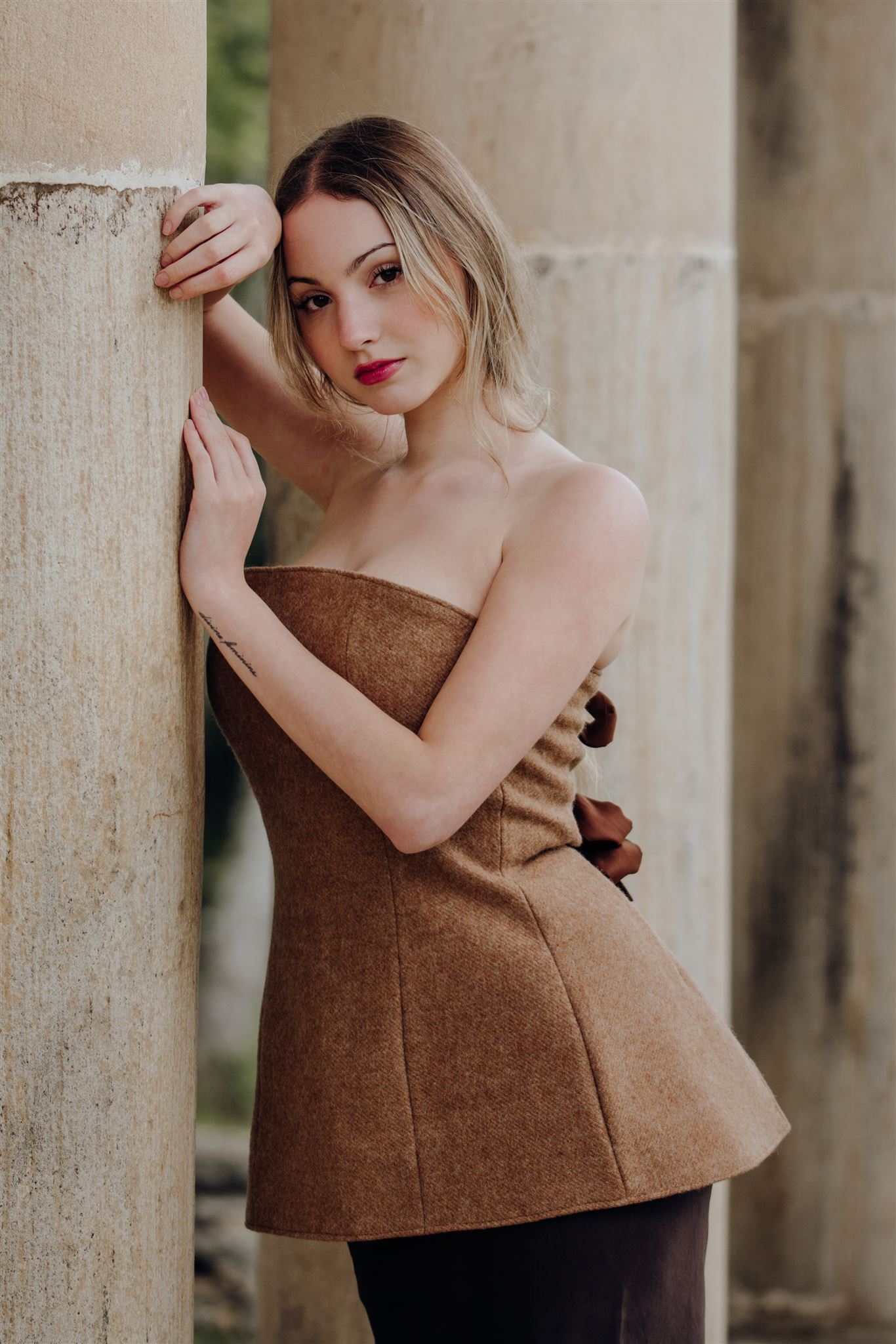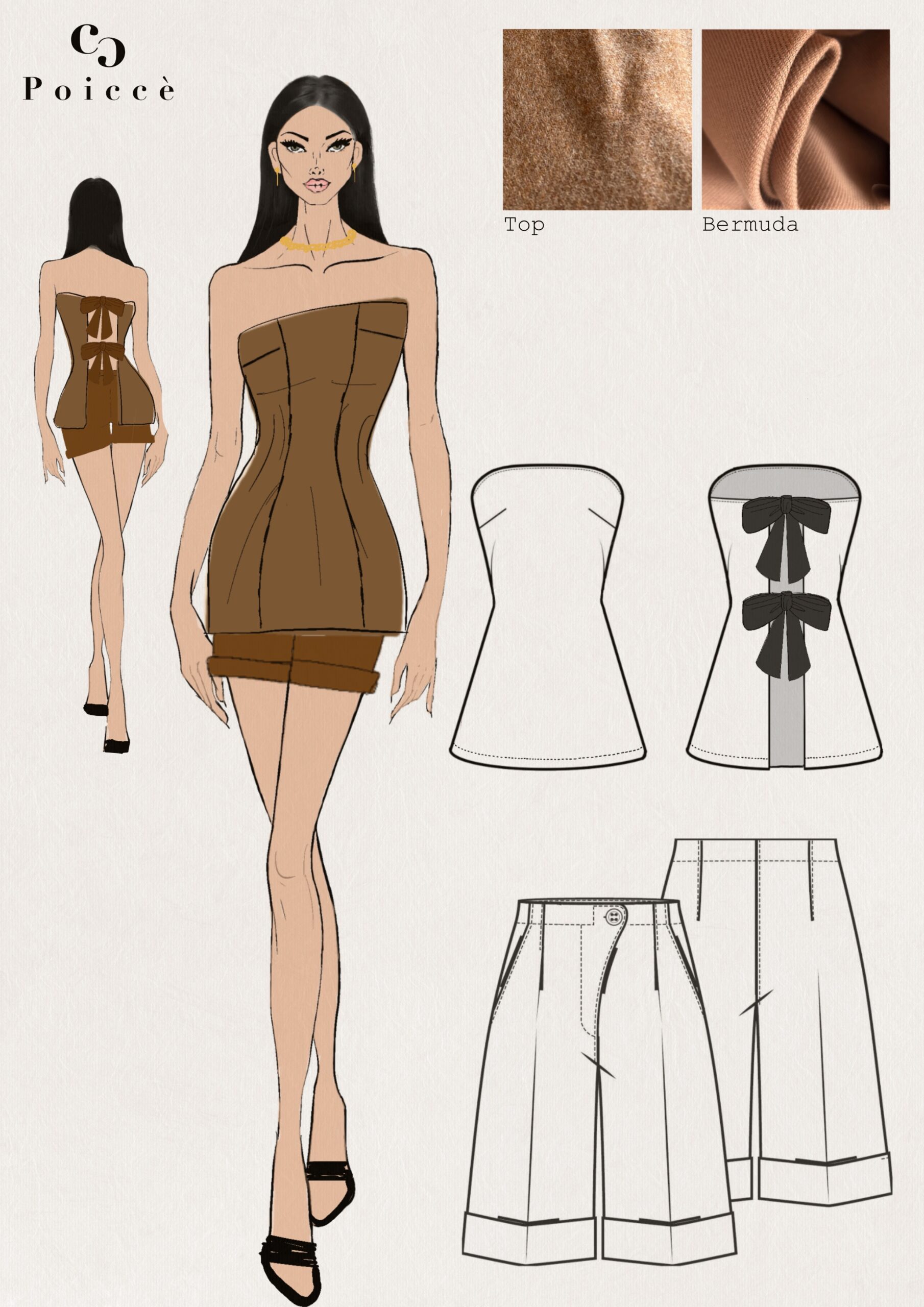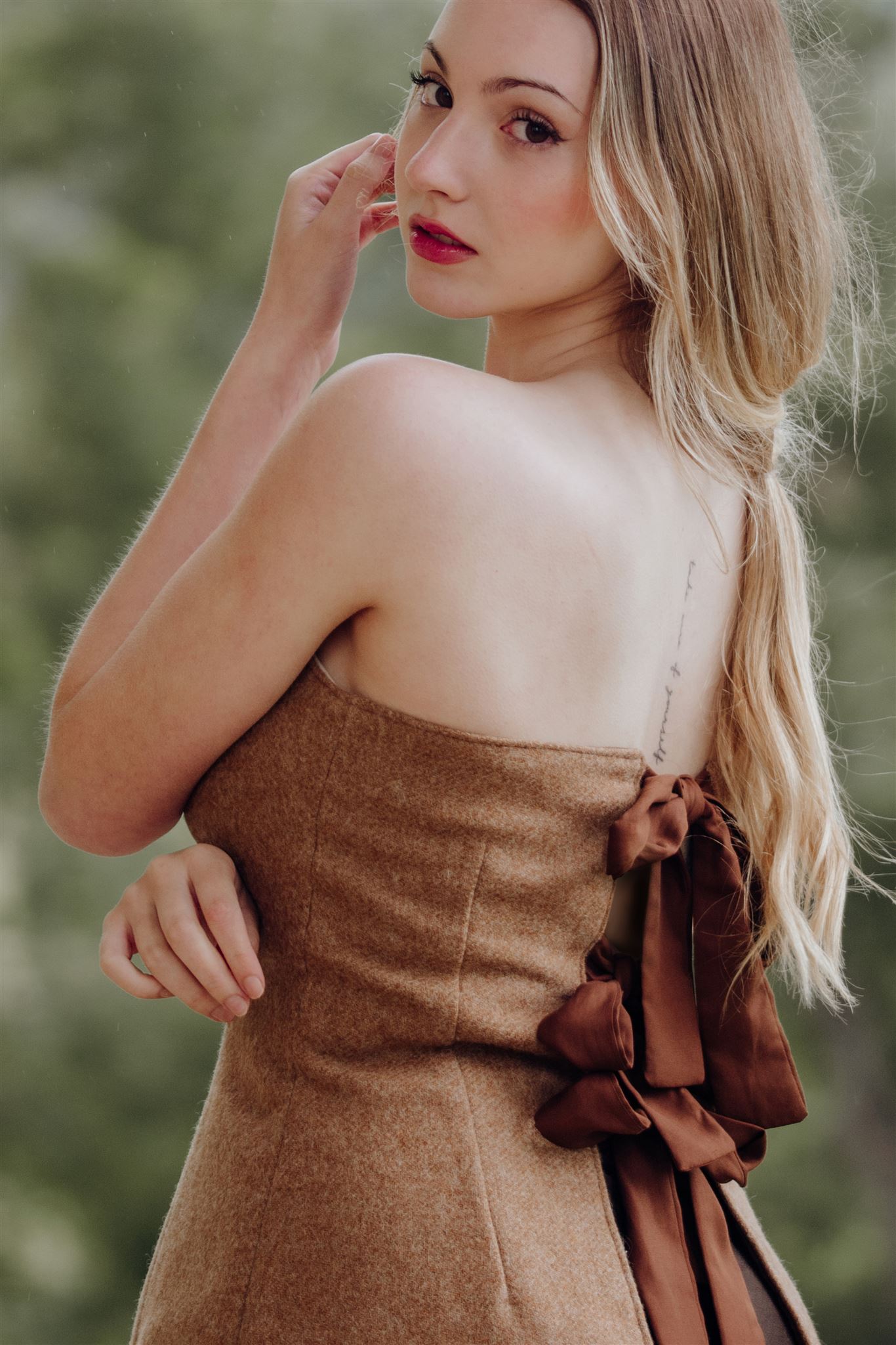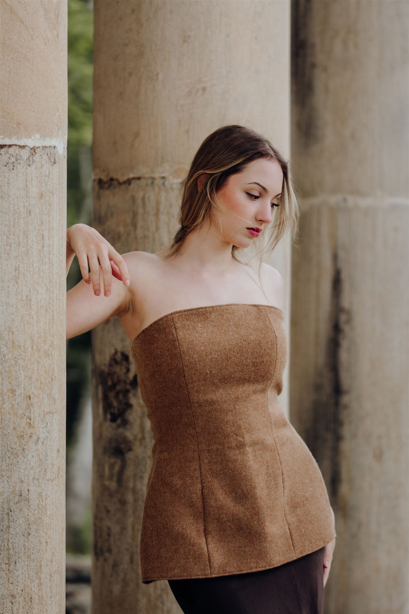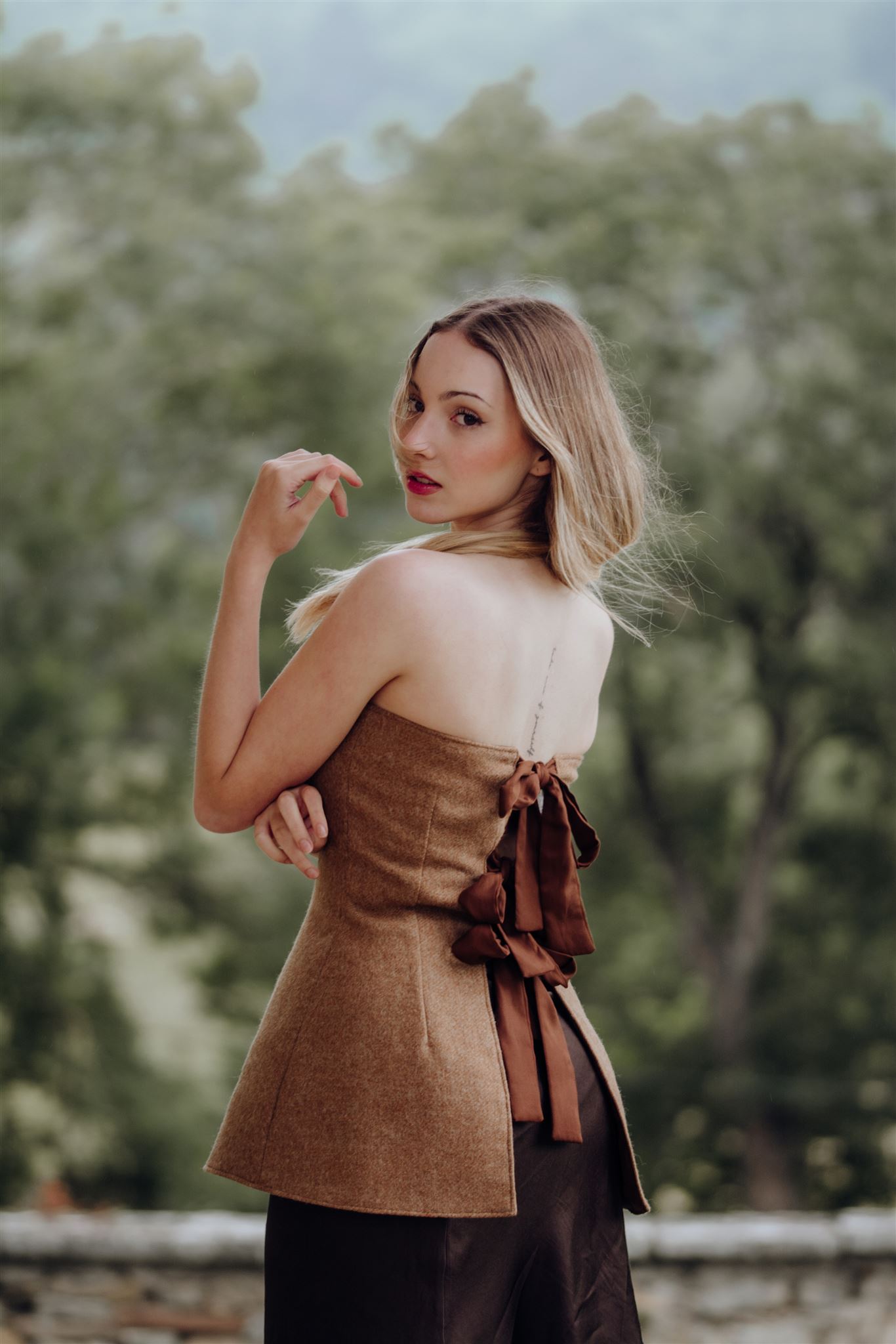 El top Gala está confeccionado en un tejido de lana, estructurado en tonos marrones. Los lazos y el forro están hechos con un tejido de algodón extra suave. Le dí cuerpo a la pieza con una entretela perchada, acentúa la cintura y su escote palabra de honor permite usarlo de forma muy versátil, solo o super poniéndolo a una camisa.